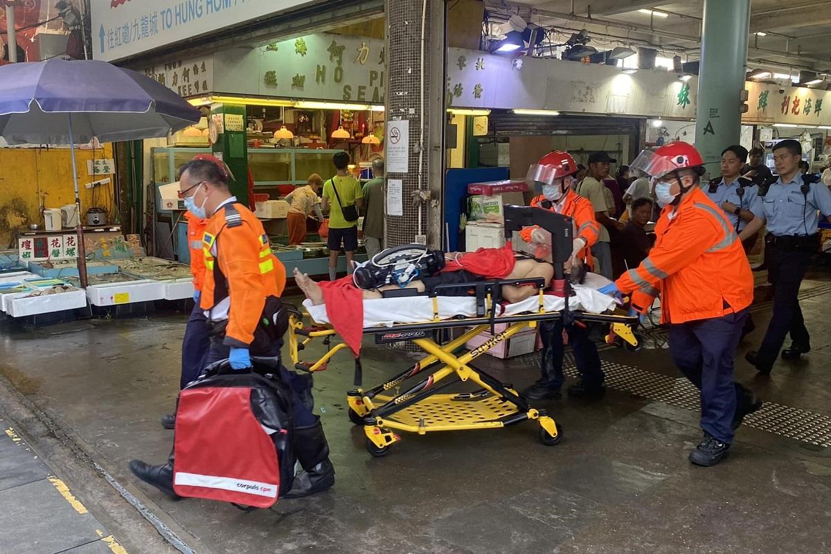墮海男子獲救後由救援人員送院搶救。(網民Sammul Wong@FB群組「香港突發事故報料區及討論區」)