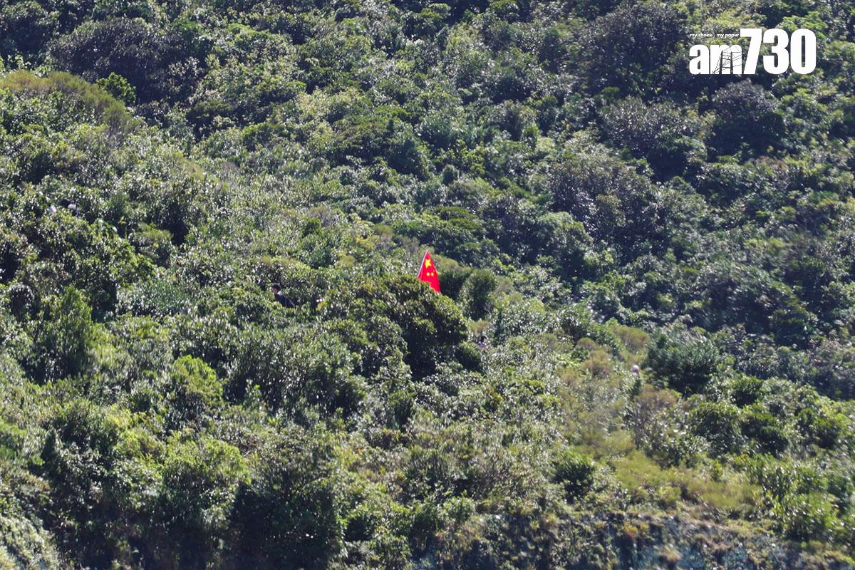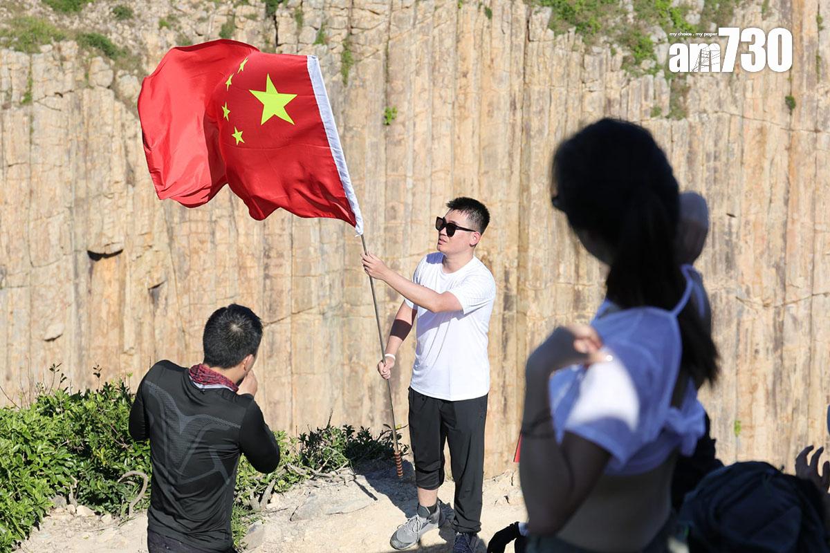 西貢萬宜水庫吸引不少內地旅客遊覽和「打卡」,有人帶同國旗到場揮舞。(吳康琦攝)