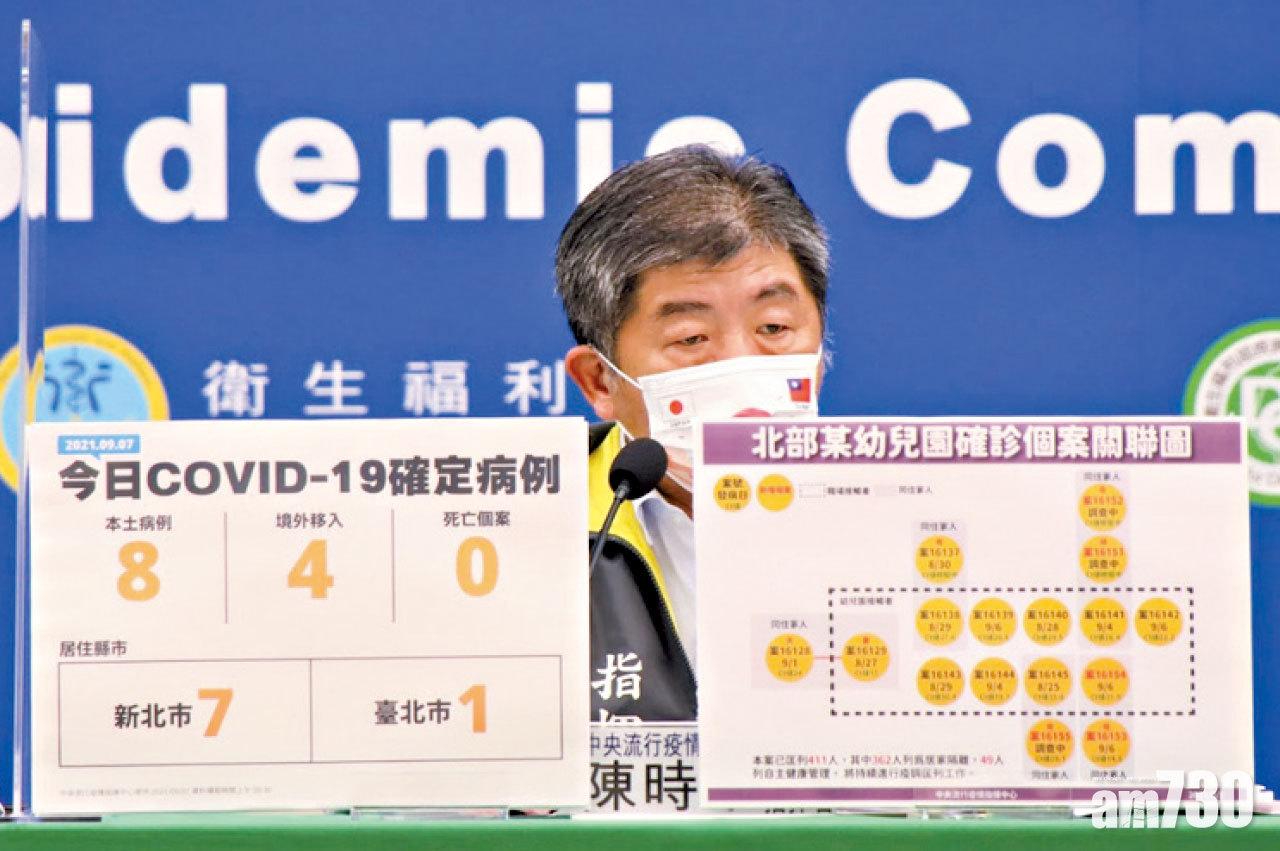 台灣幼稚園新冠肺炎群組擴大。台灣昨新增8宗本土確診,新北佔7宗、台北1宗,新北其中5名確診者屬於幼稚園群組,包括1名幼稚園學生、3名家長及1名確診學生的1歲妹妹。連同日前的9人,幼稚園群組增至16人。至於感染源頭,新北市長侯友宜表示,不一定是最先確診的幼稚園女老師,病毒亦可能是從境外回台的學生家屬傳入,而昨日確診家長中,就有1人早前從埃及回台,惟其集中檢疫期間的檢測都屬陰性。