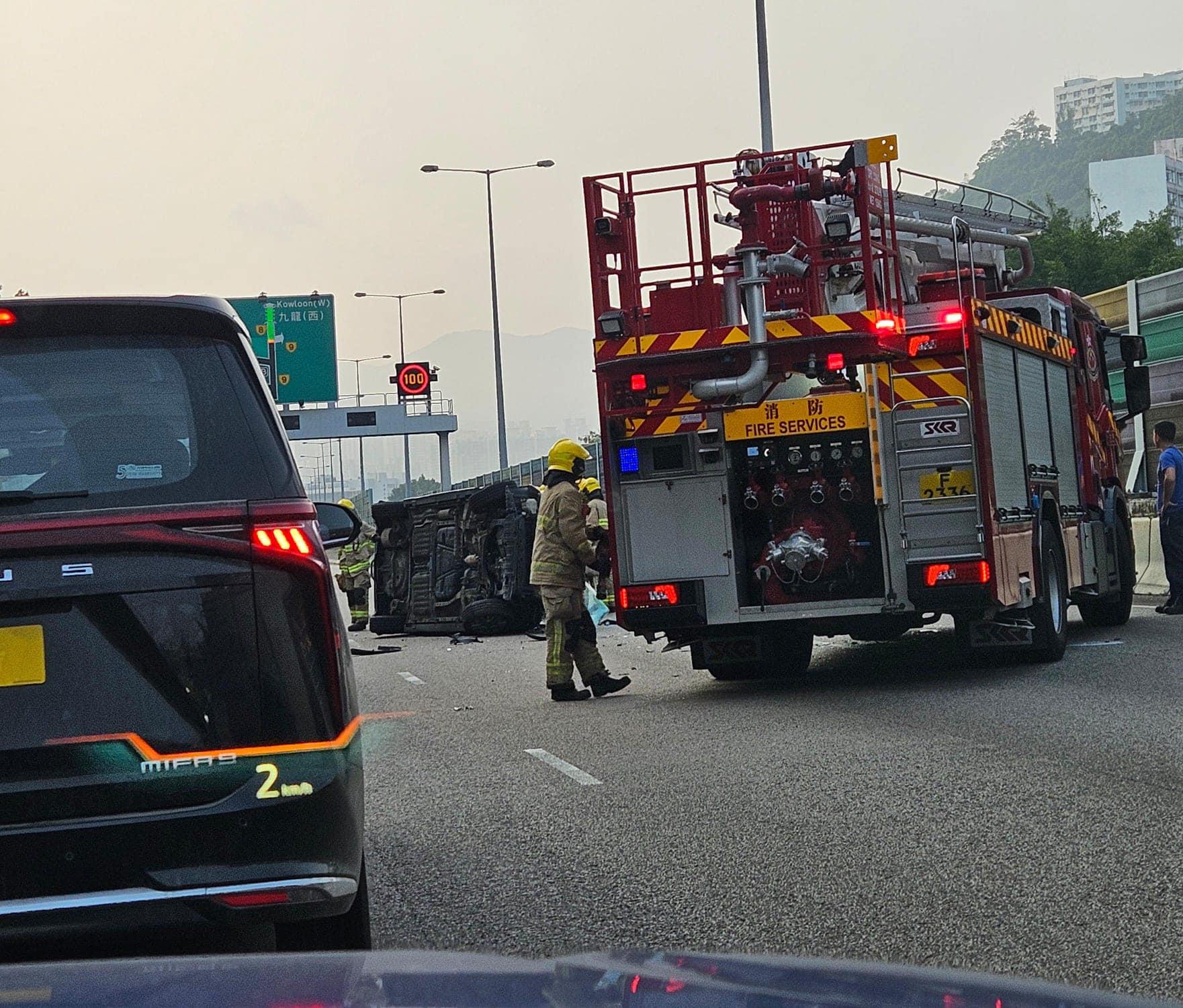 今日(12日)早上7時11分,兩輛私家車沿吐露港公路往沙田方向行駛,至科學園海逸灣對開時相撞,其中一車翻側,車內女司機一度被困,稍後自行爬出車外。