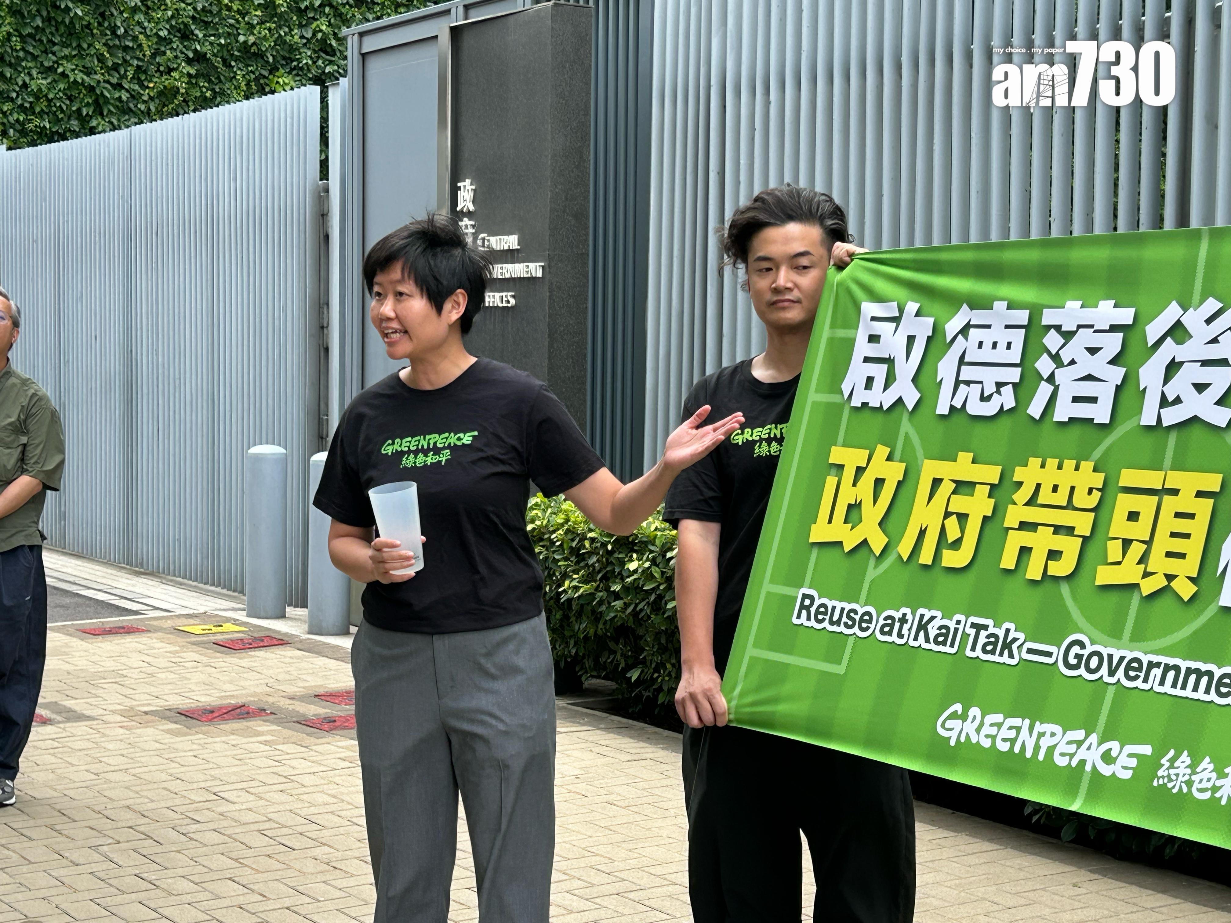 綠色和平今早在政府總部外請願,並向文化體育及旅遊局局長羅淑佩發公開信。信中指曾兩度去信啟德體育園,提倡設立重用杯系統,但對方答非所問,其後更加不再回覆。綠色和平推算體育園每年會產生數百萬件即棄餐具,11月舉行的全國運動會部分項目會在體育園舉行,而在7月則有英超三支勁旅在體育園舉行表演賽。綠色和平指出3支英超勁旅利物浦、阿仙奴和熱刺均著重環保概念,其主場都有提供重用杯服務。綠色和平減廢項目主任譚穎琳直指體育園的硬件可說是「世一」,希望環保方面亦可以是「世一」。她促請政府趁這兩個盛事,協助體育園建立重用杯先導計劃,未來再變成恆常措施,讓園方在環保上「追落後」,舉辦「綠色盛事」可成為宣傳香港的良機,「說好香港綠色故事」。