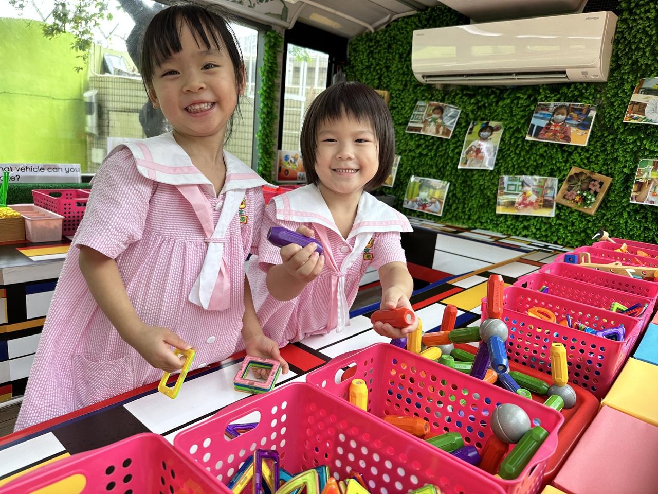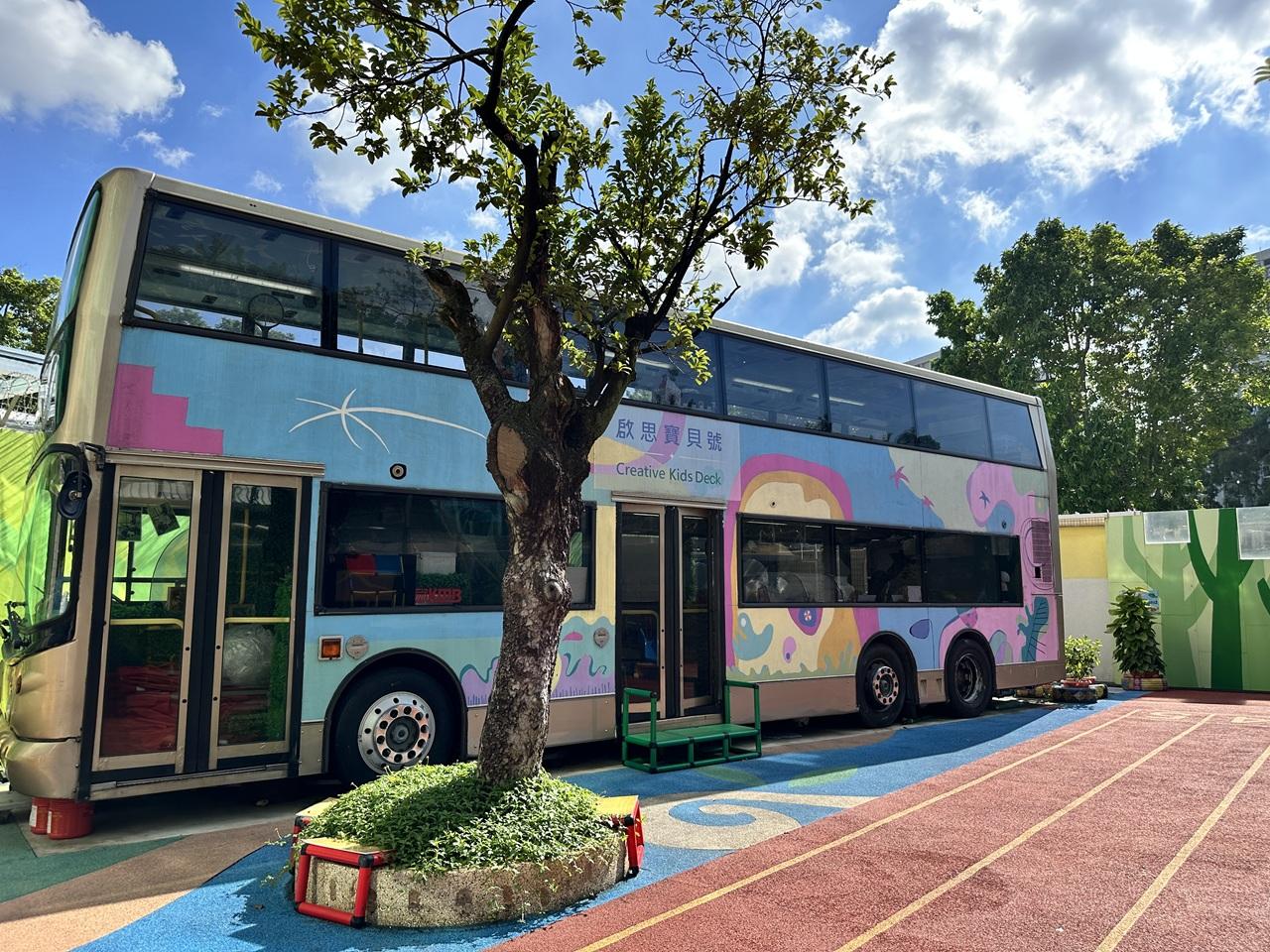 幼兒在由「啟思寶貝號」雙層巴士改建的課室遊玩。
