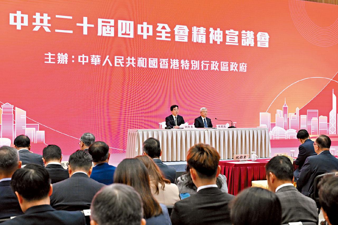 特區政府舉行首場中共二十屆四中全會精神宣講會,由中央宣講團成員侯建國和祝衛東來港宣講,約有500人出席。特首李家超表示,從「十五五」規劃可見香港在國家整體發展戰略中的定位更明確,認為必須深入理解和領會四中全會精神,並將之融匯貫通在日常事務。