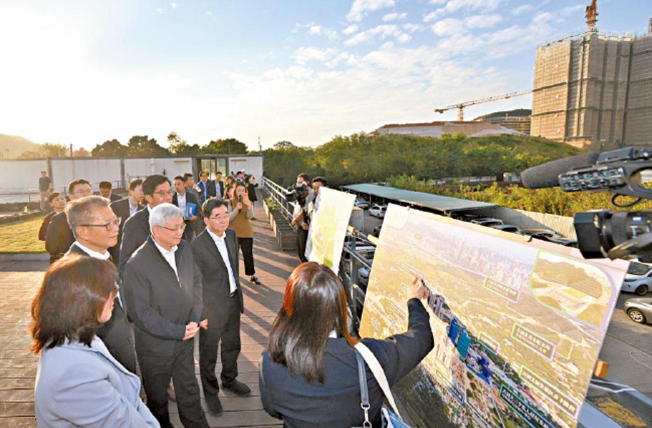 侯建國(左三)和祝衛東(左五)由財政司長陳茂波(左二)陪同實地調研北都。