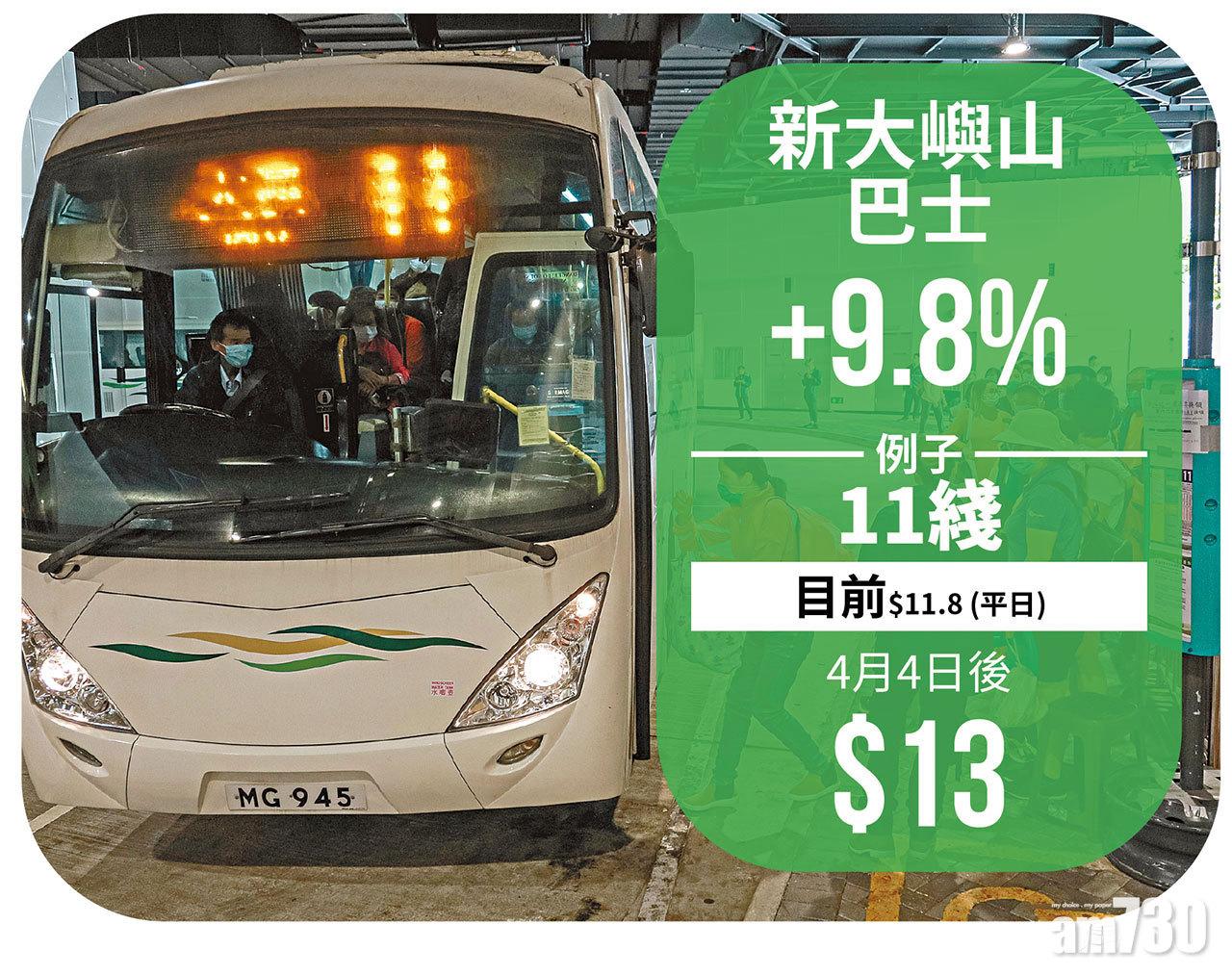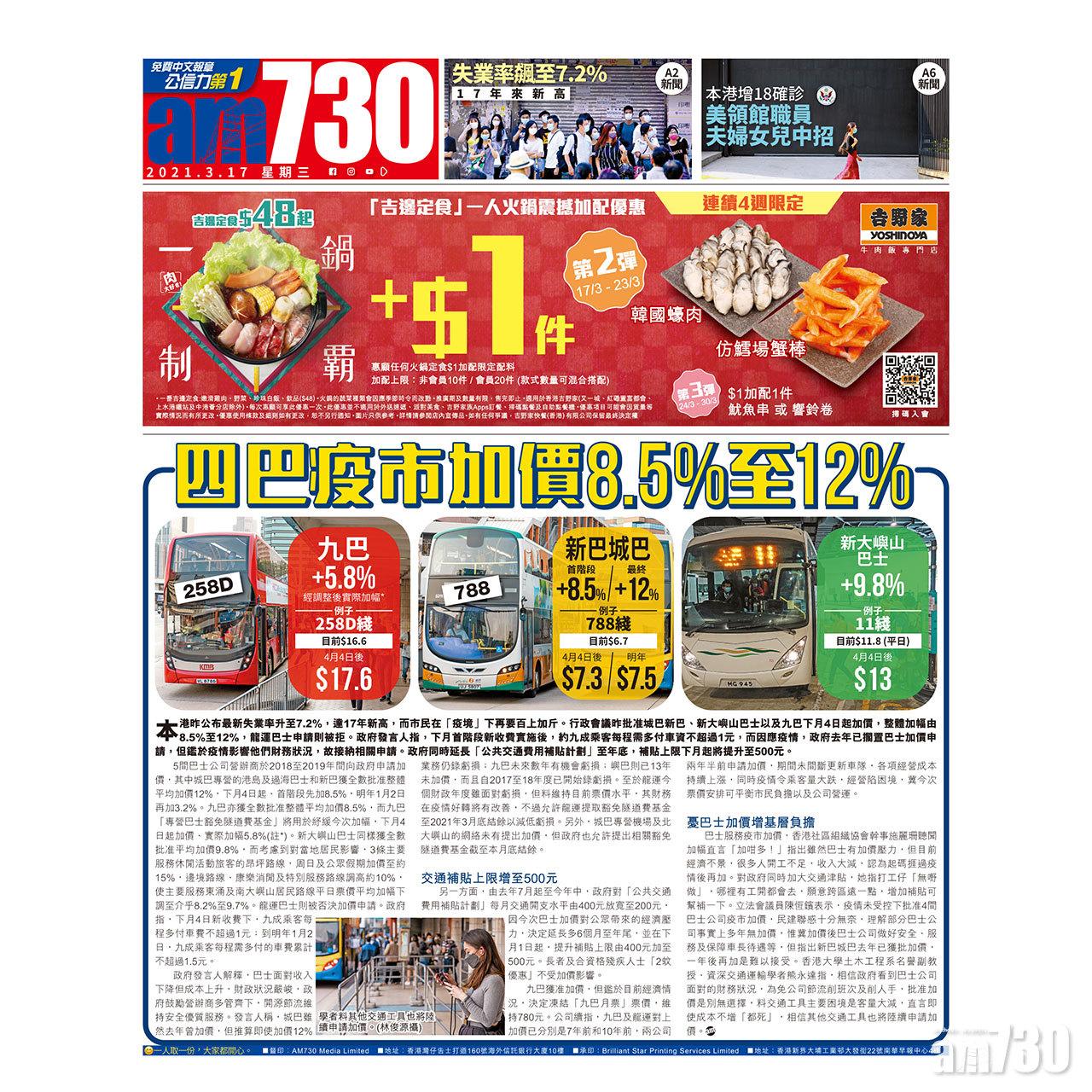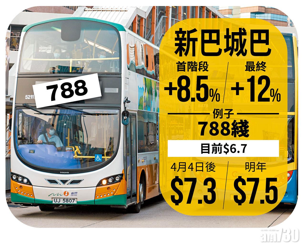 本港昨公布最新失業率升至7.2%,達17年新高,而市民在「疫境」下再要百上加斤。行政會議昨批准城巴新巴、新大嶼山巴士以及九巴下月4日起加價,整體加幅由8.5%至12%,龍運巴士申請則被拒。政府發言人指,下月首階段新收費實施後,約九成乘客每程需多付車資不超過1元,而因應疫情,政府去年已擱置巴士加價申請,但鑑於疫情影響他們財務狀況,故接納相關申請。政府同時延長「公共交通費用補貼計劃」至年底,補貼上限下月起將提升至500元。