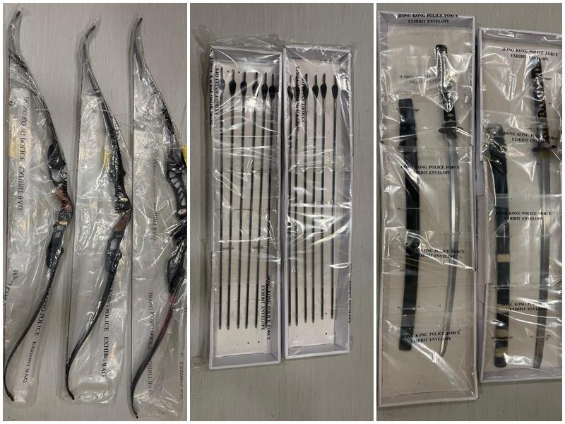 同一行動中,國安處於昨日(29日)下午突擊搜查九龍一單位,檢獲3把複合弓連同12支箭及兩把武士刀。一名46歲本地男子因涉嫌違反《簡易程序治罪條例》下的「管有攻擊性武器並有所意圖」罪名被捕,現正被扣留調查。根據上述條例,一經定罪,最高可判處罰款5,000元及監禁兩年。