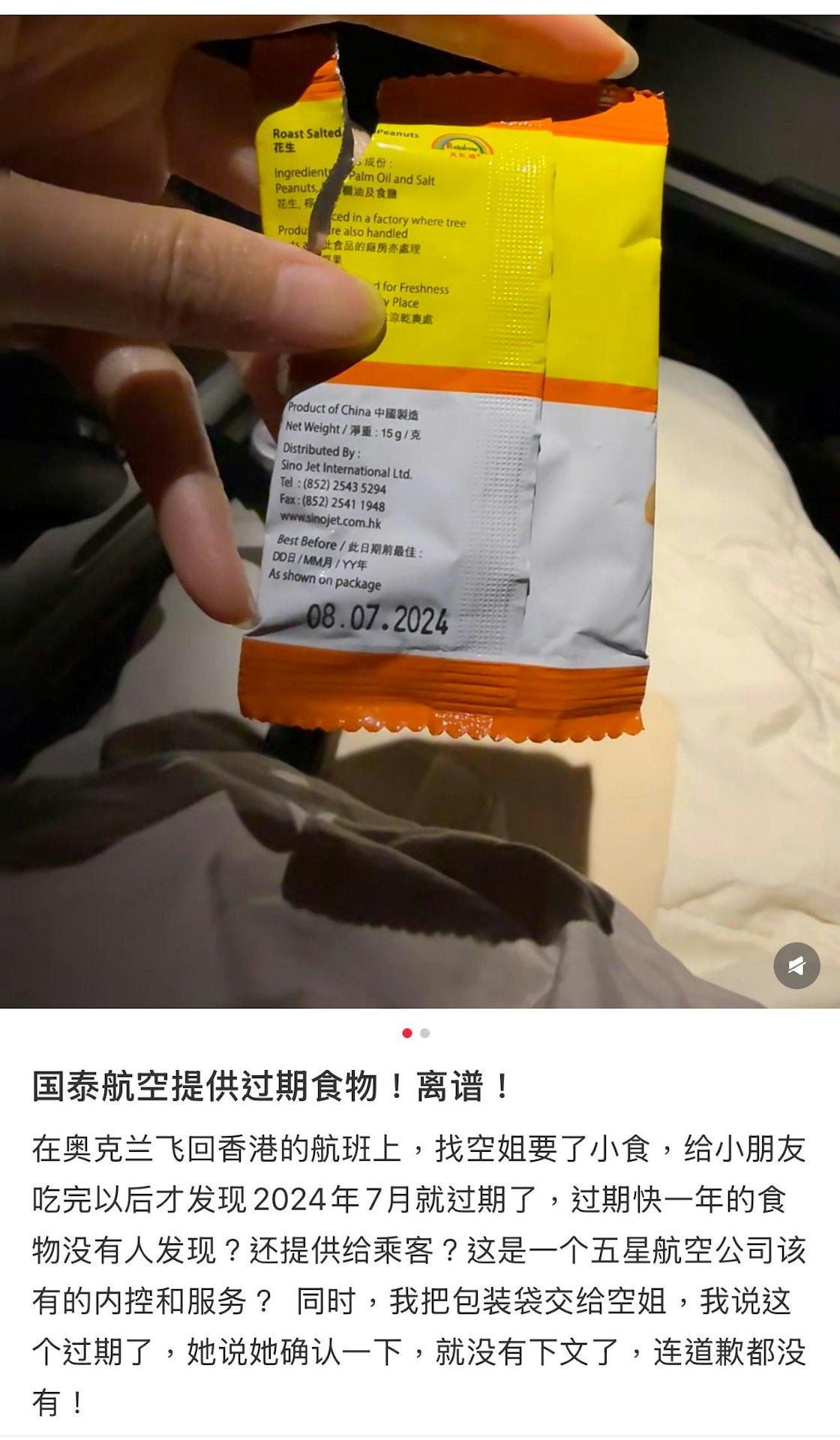 女子發文指在國泰航空由奧克蘭飛往香港的航班上,向空姐索取小食。給小朋友吃完後,發現小食包裝上的過期日子是去年7月。女子不滿國泰沒有發現小食已經過期接近1年,批評事件十分離譜,反問「這是一個五星航空公司該有的內控和服務嗎?」女子其後將小食包裝袋交給空姐,向她投訴小食已經過期。女子引述空姐回覆指「確認一下」,但再無下文,也沒有道歉。