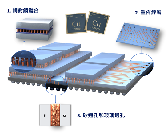 此項技術的關鍵是利用「矽穿孔(TSV)」結構、重佈線層(RDL),及以「銅對銅(Cu-Cu)鍵合」的方式垂直地連接電晶體,這對促進各層之間的信號傳遞、電力分配也至為重要。然而,若要持續縮小線寬尺寸與間距,鍵合溫度過高、銅表面氧化以及電遷移壽命等問題,仍然是下一代 3DIC 及先進封裝技術發展的重要挑戰。