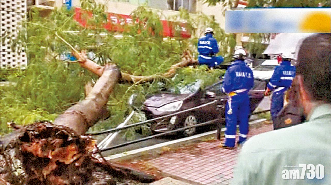 那霸有私家車被樹木壓中,車上台灣遊客幸無恙。(互聯網)