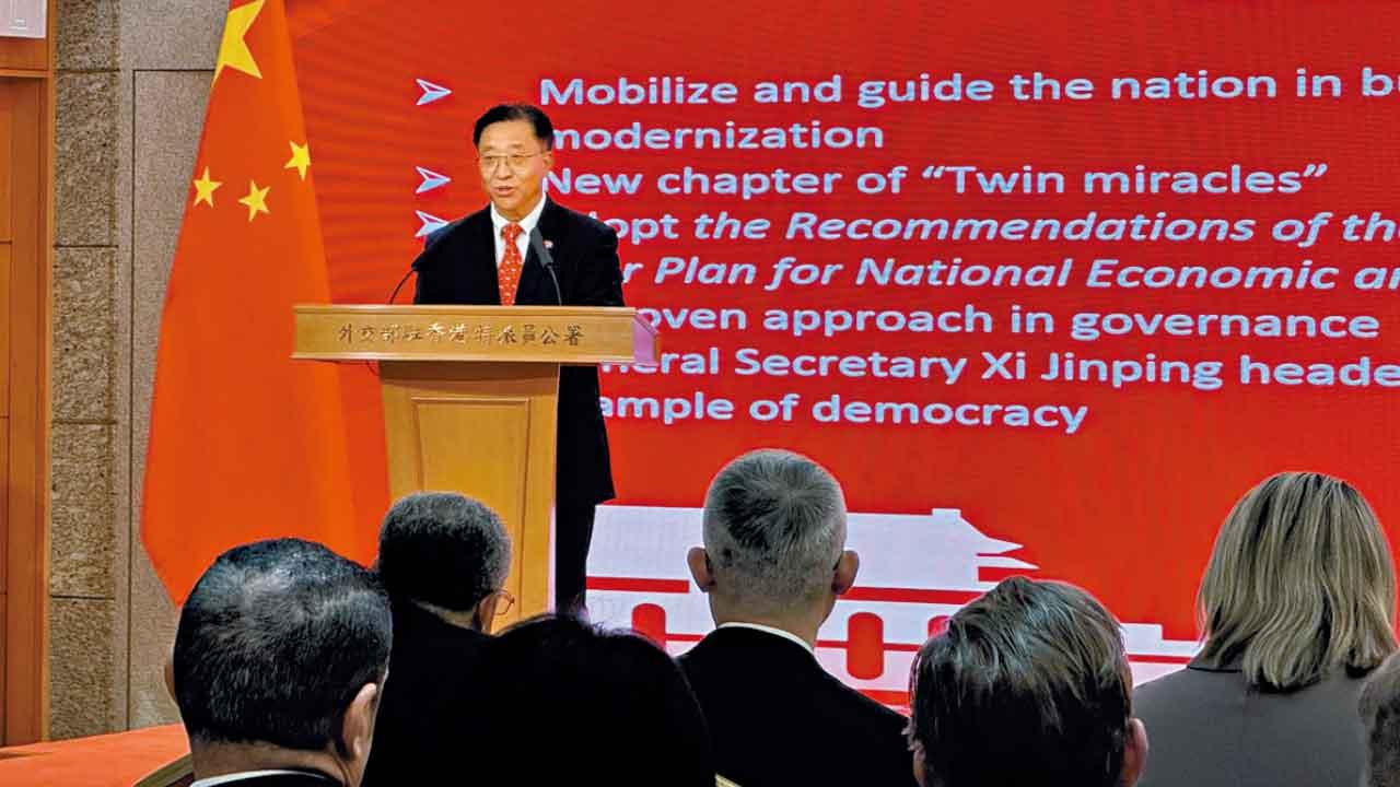 外交部駐港公署舉辦中共二十屆四中全會精神專題宣介會。約50個國家、逾60名外國駐港領團、商會及媒體代表出席。外交部駐港公署特派員崔建春表示,中國將為世界提供更多發展機遇和更佳營商環境,與中國合作就是與機遇同行,投資中國就是投資未來。