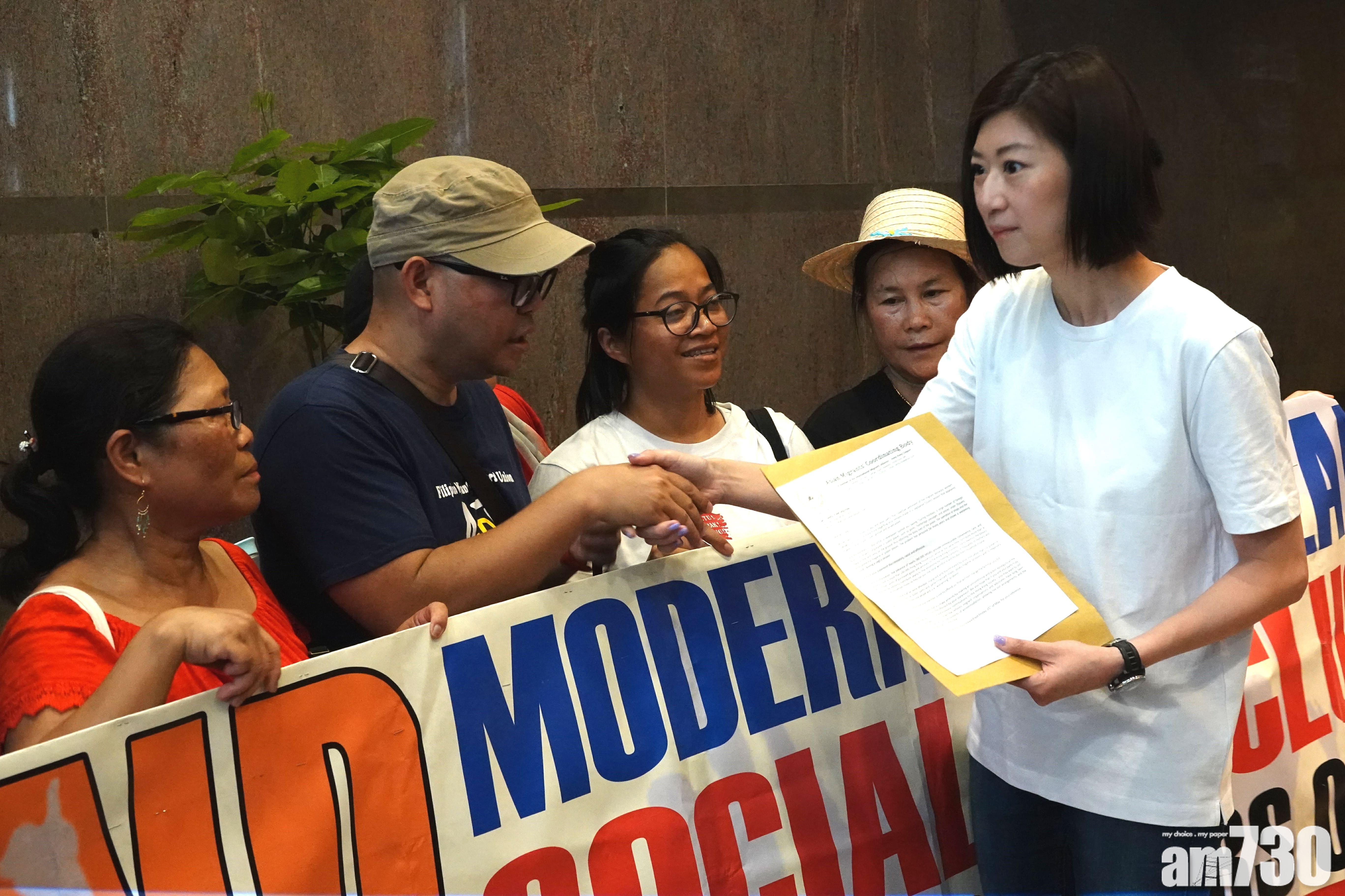 容海恩近12時在總部門口接收請願信,並以英文向團體代表稱,若其言論令外傭感到不被尊重,就此感到非常抱歉;她又指,香港面對人口老化問題,相信外傭數目會越來越多,會向政府表達外傭假日休憩空間不足的問題。但未有在傳媒面前向外傭公開道歉便轉身離開。