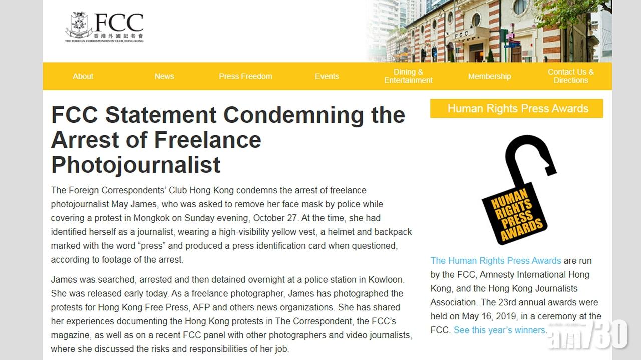 聲明指,May James為《Hong Kong Free Press》、法新社及其他新聞機構拍攝示威相片,昨晚被捕時已向警員表明記者身份,亦有穿記者背心及頭盔等,並出示記者證,但仍被警員搜查拘捕,並通宵扣查。