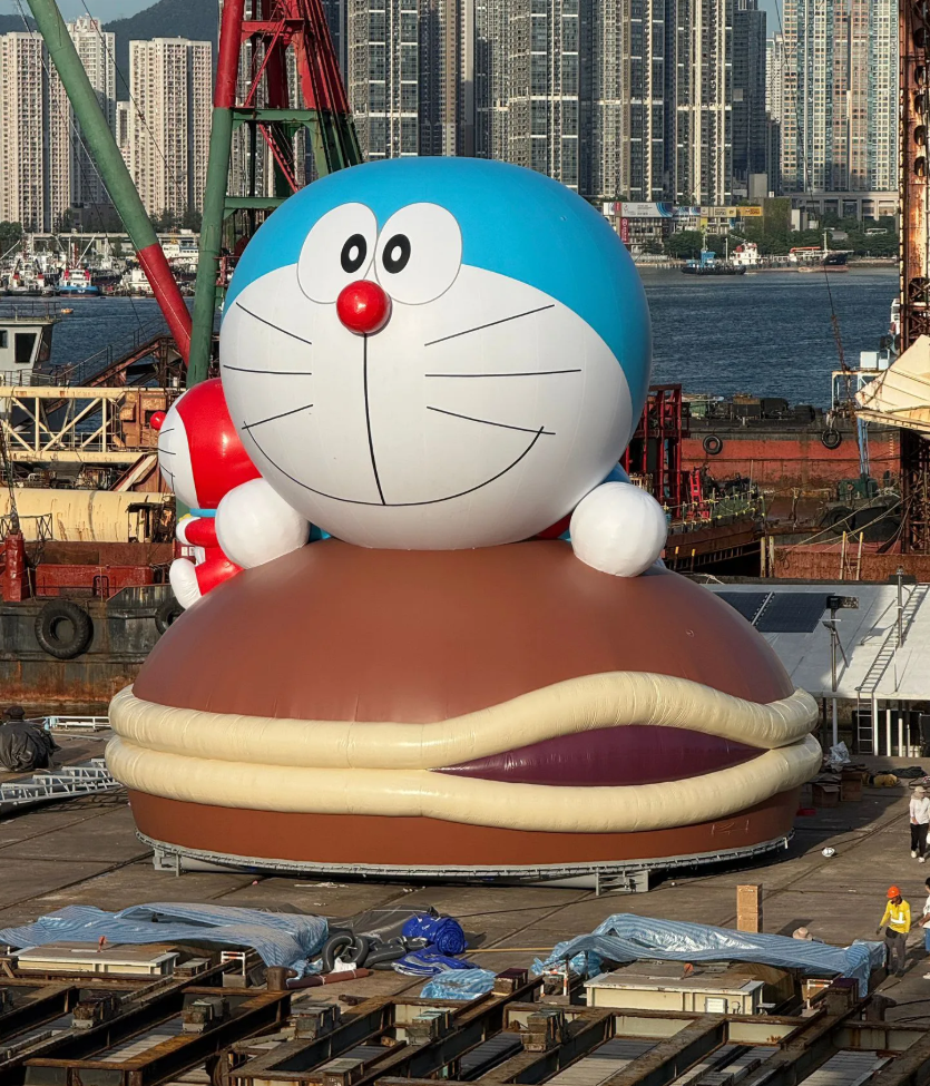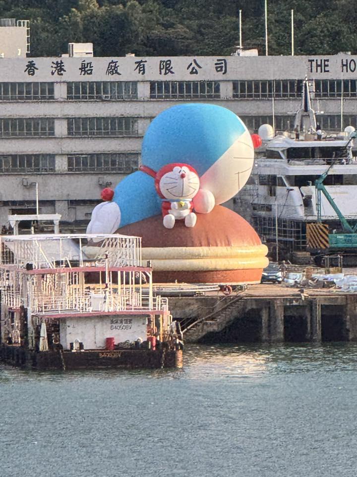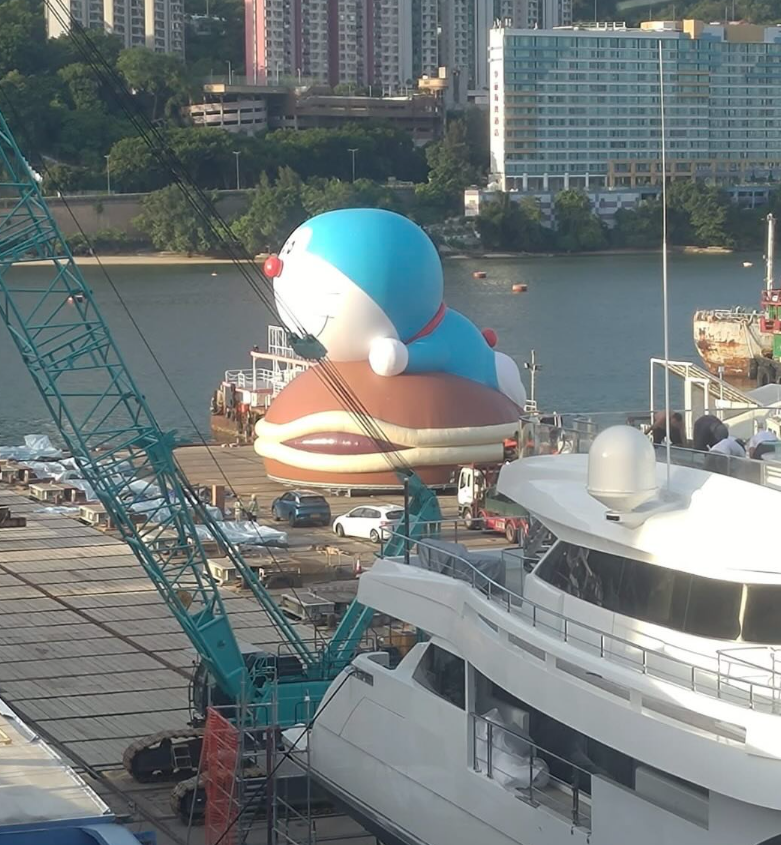 社交平台周二(16日)有網民拍攝到青衣船塢出現一個巨型多啦A夢充氣公仔,以俯臥姿勢躺平在一顆巨大的「誠實豆沙包」上,面帶微笑朝向前方,引起廣泛關注。網民紛猜測是否新一輪的多啦A夢主題活動即將登場。
