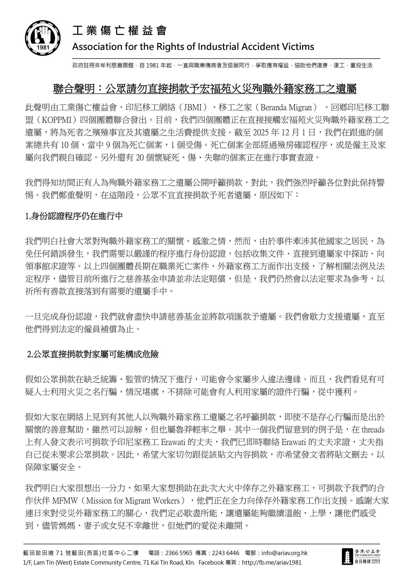 大埔宏福苑發生五級火,有不少外傭在火警中殉職或失蹤。工業傷亡權益會、印尼移工網絡(JBMI)、移工之家(Beranda Migran)、回鄉印尼移工聯盟(KOPPMI),則於今日(2日)凌晨以中、英及印尼文發出聯合聲明,呼籲公眾切勿直接捐款予殉職外傭遺屬。