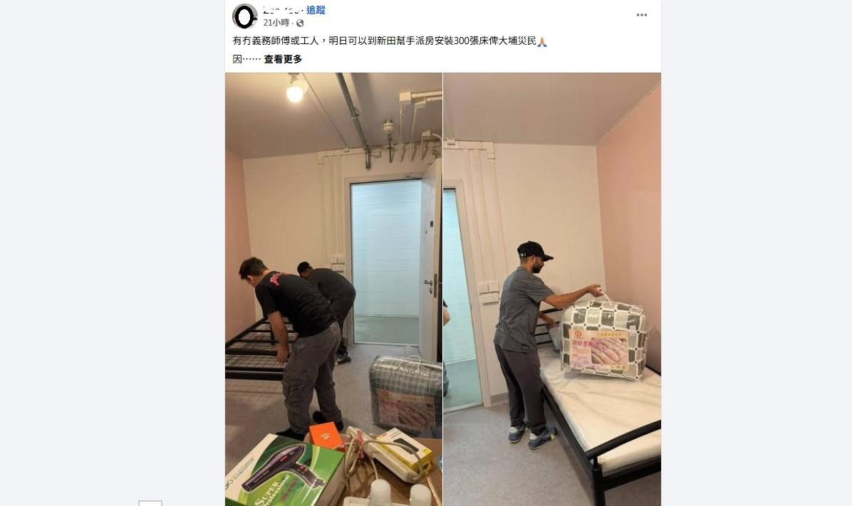 網上流傳帖文,指過渡性房屋項目「新田部屋」急需大量義工,並須自備工具前往安裝床架,以協助「大埔災民」,有網民表示擔心事件真偽。基督教香港信義會社會服務部今日(30日)發出澄清聲明,指相關訊息並非由該機構發出,並指現階段無公開招募義工安裝傢俬的安排。