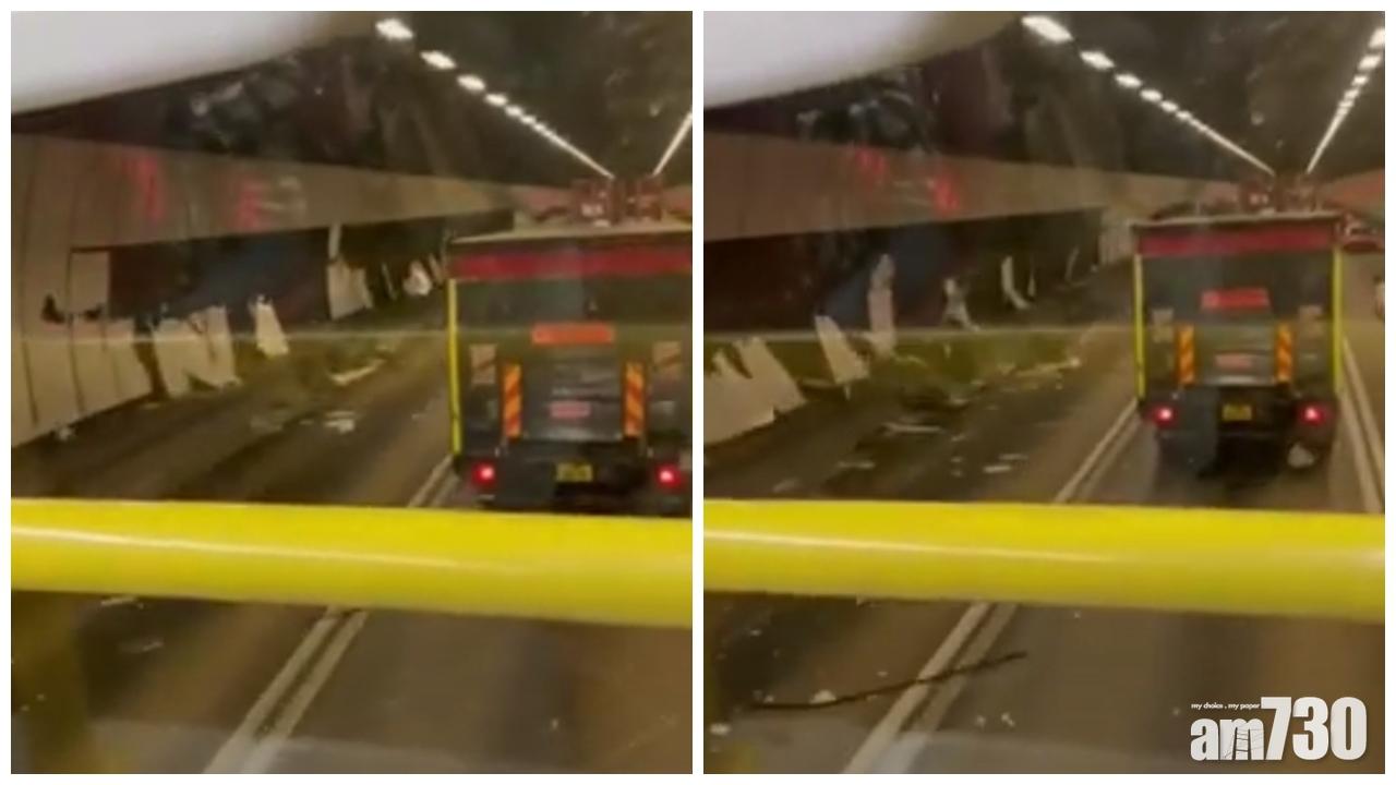大欖隧道吊臂車疑未收妥吊臂,掃毀50塊牆板。(香港突發事故報料區影片截圖)