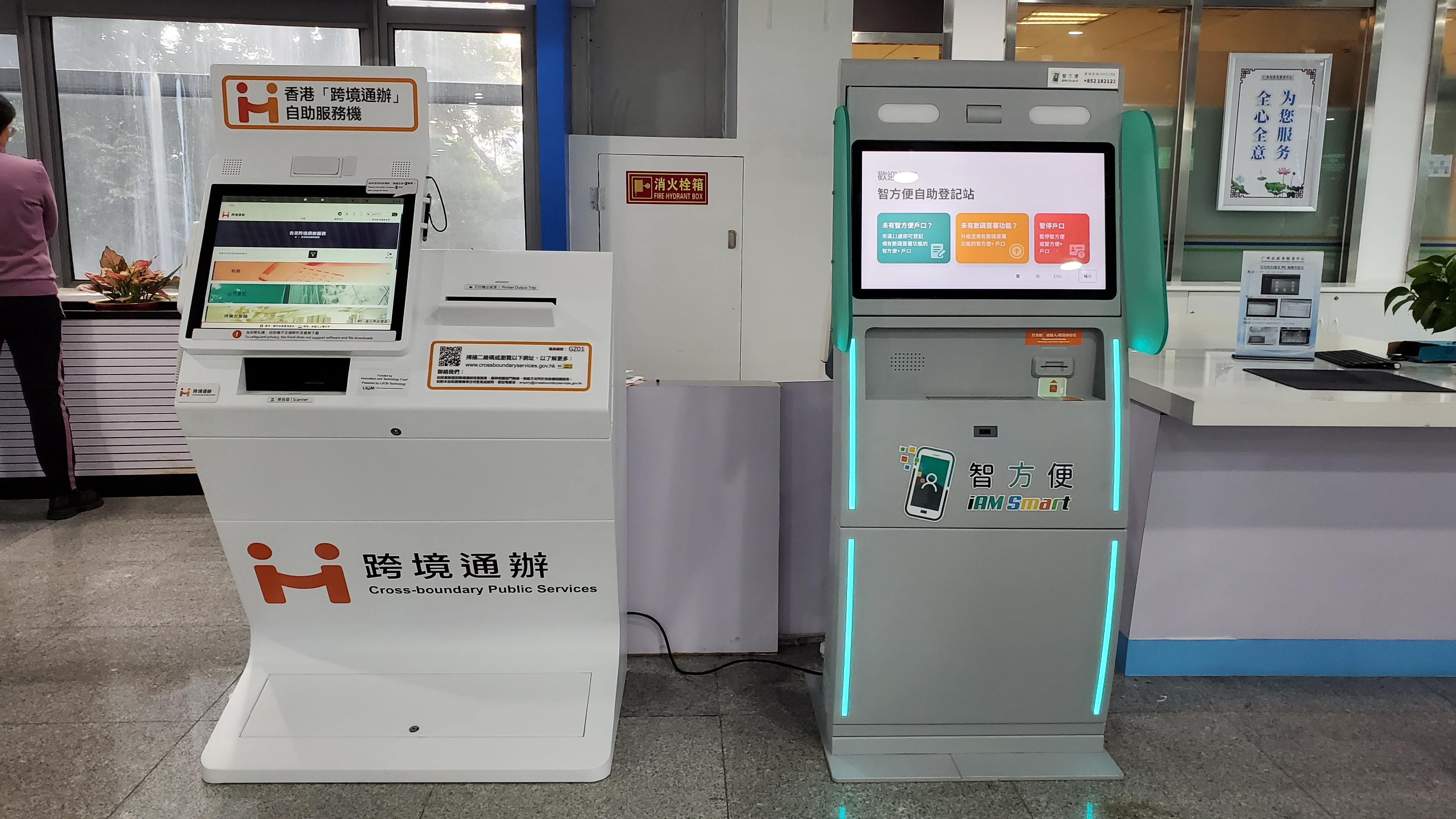 特區政府於廣州珠江新城的廣州市政務服務中心三樓大堂,設置香港「跨境通辦」自助服務機(左)。市民同時可使用設於同一地點的「智方便」自助登記站(右),辦理「智方便+」的登記或升級手續。