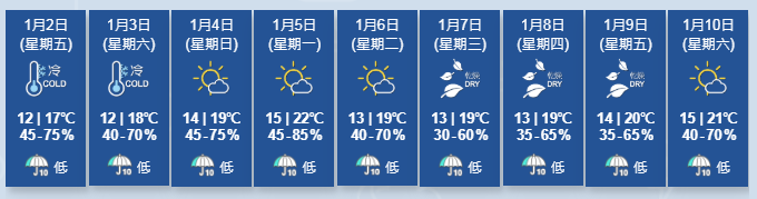 今日市區最高氣溫達攝氏21.9度,市民外出慶祝新年毋須穿厚重大衣。但氣溫即將急降,位於廣東內陸的一道冷鋒逐漸向南移動,晚上橫過廣東沿岸地區,預計深夜氣溫下降至約16度,打鼓嶺出現12度低溫。