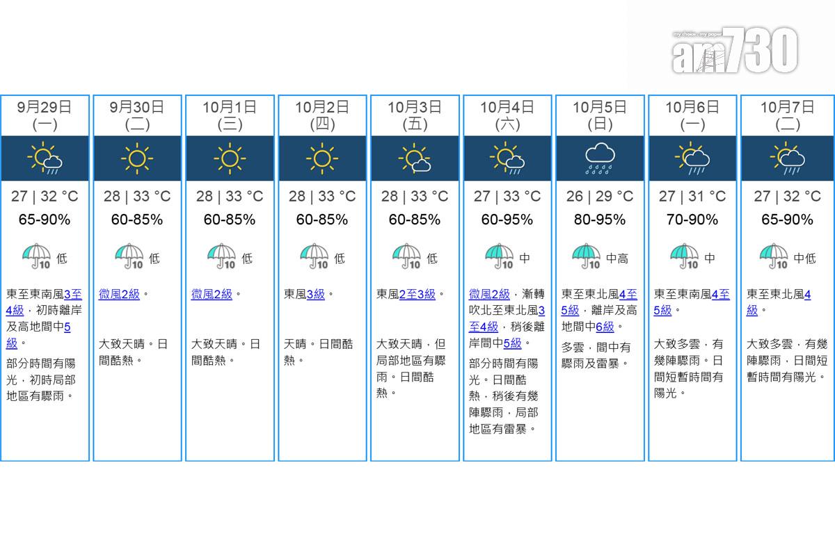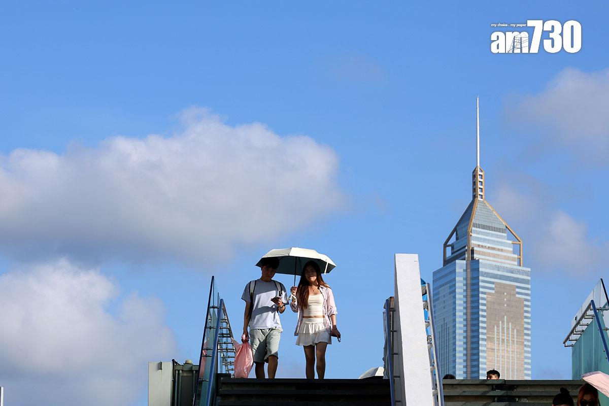 本港天氣持續酷熱,中午12時許錄得室外氣溫攝氏31.3度。香港天文台表示,今日下午大致多雲,有幾陣驟雨,下午短暫時間有陽光,局部地區有雷暴,吹和緩至清勁偏東風,初時離岸及高地間中吹強風,海有湧浪,展望未來數日大致天晴及酷熱。