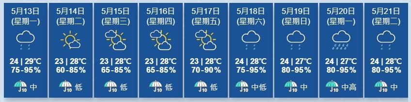 天文台展望未來數日短暫時間有陽光,風勢較大。天文台指,一股較乾燥的偏東氣流會在今日稍後抵達廣東沿岸,隨後數日該區天色大致良好,風勢較大。預料偏東氣流會在下周初逐漸被不穩定的偏南氣流取代,華南沿岸有驟雨及幾陣雷暴。