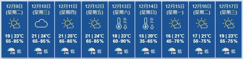 天文台展望星期六北風增強,有一兩陣雨,晚上氣溫顯著下降。下周初最低氣溫在15、16度左右。(香港天文台)