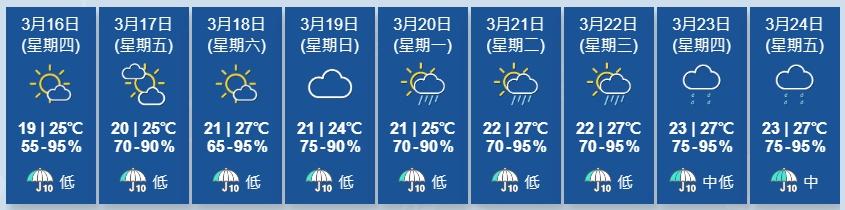 天文台又指,影響華南的東北季候風會在周末緩和,而一股清勁偏東氣流會在星期日抵達廣東沿岸。預料潮濕的偏南氣流會在下周初至中期逐漸影響沿岸地區,該區有一兩陣驟雨。而一道低壓槽會在下周中後期為華南帶來不穩定天氣。