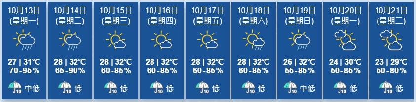 根據天文台未來9天天氣概況顯示,下周初氣溫顯著下降,下周二(21日)最低氣溫降至23度。(香港天文台)