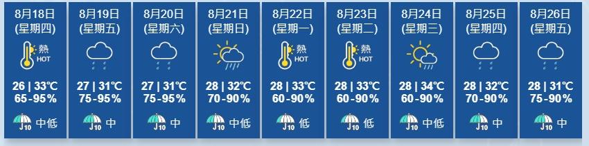 天文台表示,一道廣闊低壓糟正為廣東沿岸及南海北部帶來驟雨。本港今早多處地區錄得超過5毫米雨量。本港地區今日天氣預測大致多雲,有幾陣驟雨。日間短暫時間有陽光及炎熱,最高氣溫約32度。吹和緩南至東南風。今日的最高紫外線指數大約是12,強度屬於極高。展望未來一兩日有幾陣驟雨。下周初漸轉大致天晴及酷熱。