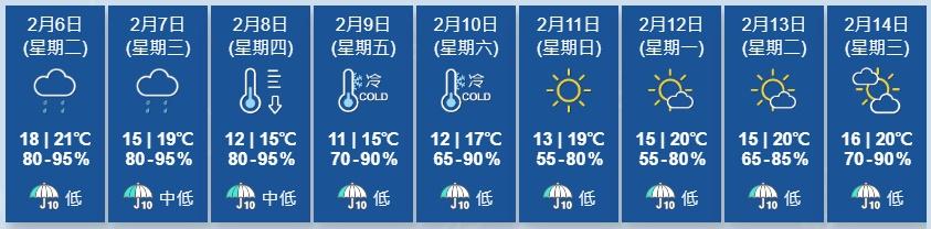 天文台展望未來一兩日有幾陣雨。年廿九顯著轉冷,除夕及年初一早晚寒冷,最低氣溫約11度左右。(香港天文台)