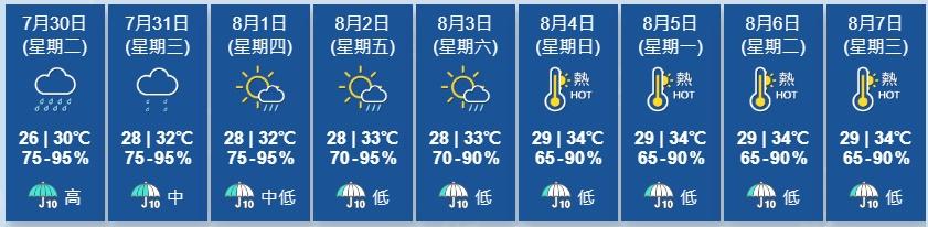 天文台展望未來一兩日驟雨逐漸減少。接近週末至下周初部分時間有陽光及酷熱。天文台指,一道廣闊低壓槽會在今日為華南沿岸及南海北部帶來驟雨及雷暴。預料該低壓槽會在未來一兩日稍為減弱,但沿岸地區仍有幾陣驟雨。隨著高空反氣旋逐漸增強,本周後期至下周初中國東南部天色好轉,日間酷熱。