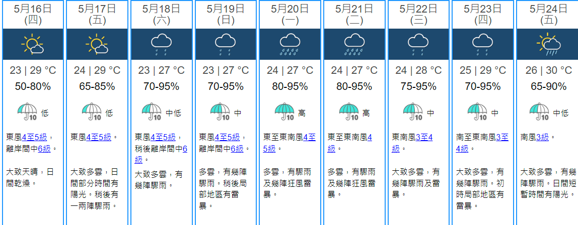 天文台預測,本港下午及夜晚天晴乾燥,下午天氣炎熱,吹和緩偏東風。展望未來一兩日部分時間有陽光,周末有幾陣驟雨。一股乾燥的偏東氣流會在未來一兩日為廣東沿岸帶來大致晴朗的天氣。受高空擾動影響,週末期間華南有幾陣驟雨。預料一道廣闊低壓槽會在下週初至中期影響南海北部及廣東沿岸,該區天氣不穩定,有驟雨及雷暴。