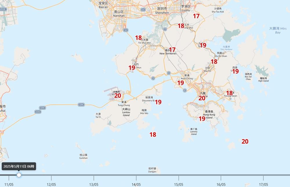 自動分區天氣預報圖顯示明日清晨6時,大部分市區約19度,新界地區更低見17度。(香港天文台)