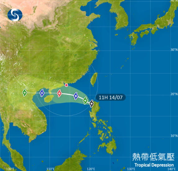【12:35更新】天文台表示,位於呂宋附近的低壓區已增強為熱帶低氣壓,並位於本港800公里範圍內。按照現時預測路徑,該熱帶低氣壓今日(14日)與本港保持一段距離。天文台會視乎該熱帶低氣壓的移動及發展,在明日(15日)早上考慮發出一號戒備信號。預料該熱帶低氣壓會在未來兩三日逐漸增強,大致移向廣東西部至海南島一帶。會否發出更高的熱帶氣旋警告信號,視乎該熱帶氣旋與珠江口的距離及會否顯著增強。