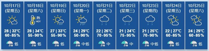 【23:14更新】天文台今日(17日)發表「天氣隨筆」,指一股強烈東北季候風會在星期日(19日)抵達廣東沿岸,該區北風會逐漸增強。在季候風及熱帶氣旋的共同效應下,隨後數日風勢持續頗大,漸轉多雲有雨,下周中期市區氣溫顯著下降至20度左右,新界再低兩三度。由周末至下周中,氣溫會由酷熱轉為較為接近清涼水平,市民請留意天氣的急劇變化。預料該熱帶氣旋會逐漸靠近廣東沿岸,屆時該區會開始受季候風及熱帶氣旋的共同影響,下周初至中期風勢持續頗大。而隨著該熱帶氣旋的環流逐漸影響廣東沿岸,天文台屆時或會直接發出三號強風信號,取代強烈季候風信號,而不會發出一號戒備信號。