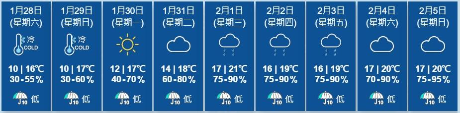 【13:00更新】本港天氣再度冷冰冰!天文台在正午12時發出寒冷天氣警告,預測本港地區今晚及未來兩三日天氣寒冷,周末及周日市區最低氣溫約在10度左右,新界會再低幾度,呼籲市民應注意保暖,下周中期漸轉多雲,有一兩陣雨,氣溫回升至16至20度之間。現時強烈季候風信號及紅色火災危險警告亦正在生效。