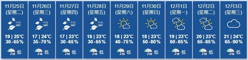 天文台展望本周持續天晴乾燥,早上清涼,日夜溫差頗大。下周初雲量增多。天文台又指,受東北季候風及其補充持續影響,本周中後期華南普遍晴朗,天氣非常乾燥,早上清涼,日夜溫差頗大。此外,現時位於菲律賓的熱帶氣旋會在今日繼續發展並向西移動,在本周中後期橫過南海中南部,大致移向越南至海南島以南海域一帶並逐漸減弱。而一道雲帶會在下周初靠近廣東沿岸及南海北部。