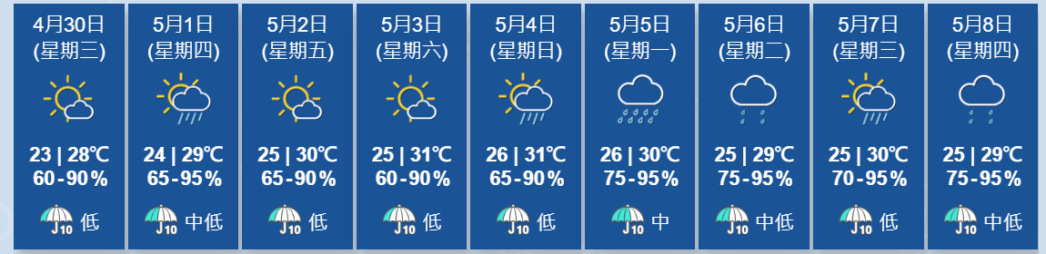 本港地區今日天氣預測大致多雲。日間部分時間有陽光,市區最高氣溫約28度,稍後局部地區有驟雨。吹和緩偏東風。展望未來兩三日部分時間有陽光,日間炎熱,但勞動節有幾陣驟雨。