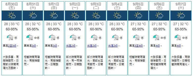 根據天文台九天天氣預報,本港未來一連九日有驟雨,明日(31日)短暫時間有陽光,有幾陣驟雨,最高32度。下周日(9月1日)、下周一(9月2日)開學日至下周三(9月4日)均酷熱達33度,短暫或部份時間有陽光、有驟雨。下周四(9月5日)至下周六(9月7日)均有幾陣驟雨,短暫時間有陽光,最高32度。