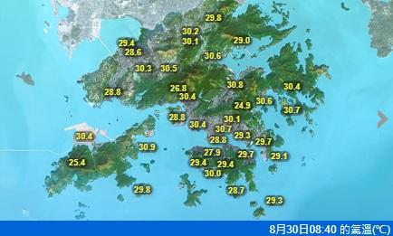 暑假最後3日天氣酷熱有雨!現時酷熱天氣警告正在生效,天文台預料今日(30)本港天氣酷熱,市民應慎防中暑。天文台指一道廣闊低壓槽正為廣東沿岸及南海北部帶來驟雨及雷暴,同時華南沿岸風勢微弱,預測本港今日大致多雲,有幾陣驟雨。日間部份時間有陽光及酷熱,市區最高氣溫約33度,新界再高一兩度。吹輕微至和緩偏東風。