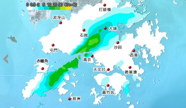 今早大嶼山及新界部分地區錄得超過10毫米雨量。(香港天文台)