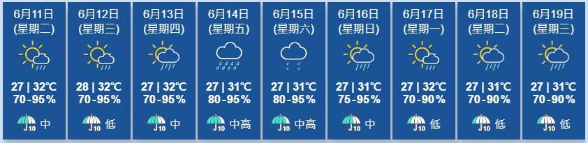 天文台展望未來一兩日部分時間有陽光及炎熱,亦有幾陣驟雨。接近週末驟雨較多。(香港天文台)