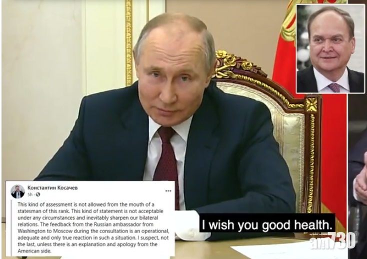 普京表示,會向拜登說「祝你身體健康」。就拜登指普京是殺人兇手,俄羅斯召回駐美大使安東諾夫(小圖),討論美俄關係日後走向。(互聯網)