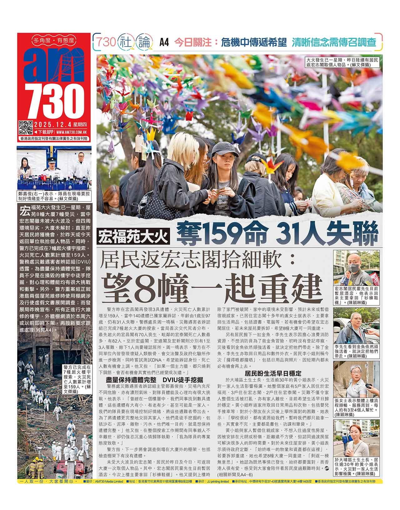 宏福苑大火發生已一星期,屋苑8幢大廈7幢受災,當中宏志閣雖未被大火波及,但四周環境惡劣,大廈未解封;直至昨天居民終獲機會,於昨天或今天返回單位執拾個人物品。同時,警方已完成在7幢起火樓宇搜索,火災死亡人數累計增至159人。警務處災難遇害者辨認組(DVIU)透露,為盡量保持遺體完整,隊員不少是在損毀的樓宇中徒手挖掘,對心理和體能均有很大挑戰和衝擊。另外,警方重案組正就港島兩個屋苑維修時使用棚網涉及行使虛假文書展開調查;而發展局昨晚宣布,所有正進行大維修的樓宇,外牆棚網須於本周六或以前即時下架,再按新要求跟進處理。