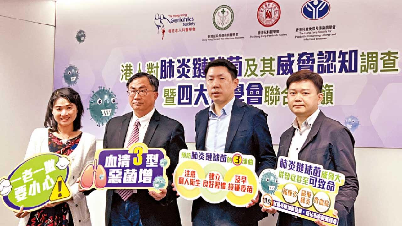 口罩令解除,近日染新冠和流感個案不容忽視外,亦要慎防肺炎鏈球菌。四個醫學會聯合調查發現,超過三成人以為肺炎鏈球感染並不常見,近八成人沒有接種相關疫苗,願意接種者更僅兩成。學會指,近日肺炎鏈球菌個案增加,當中幼兒及長者屬高危群組,感染肺炎鏈球菌後可引發肺炎及腦膜炎等併發症,死亡率高達近一半,呼籲高危市民盡早接種疫苗,促請政府及早引入新一代疫苗。