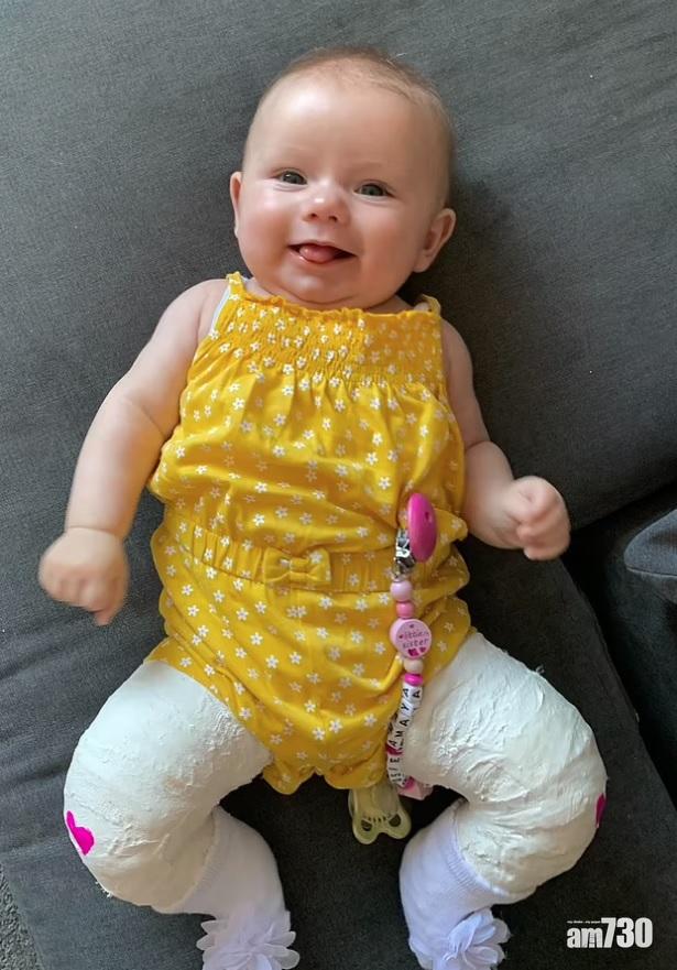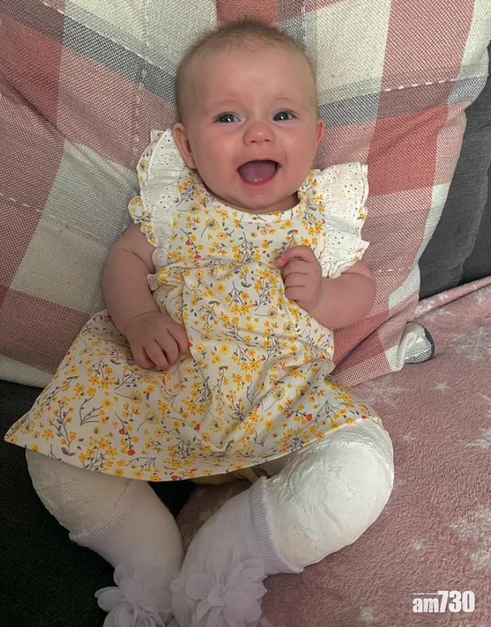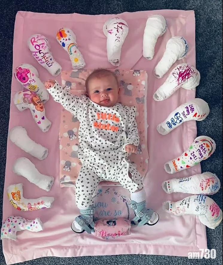英國北威爾斯(North Wales) 14周大B女羅絲(Rosie)頑抗其先天性疾病的力量之強,令人驚訝。22歲母親勞倫(Lauren)對《每日郵報》表示,她懷孕20周接受掃瞄檢查時,發現女兒先天性腳掌內翻,一直擔心她往後無法正常走路,及至女兒出生後11天,便按醫生建議給她戴上矯形腳套,冀能令腳掌變直。