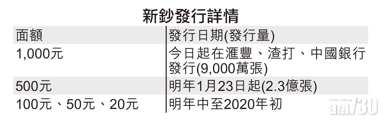 新年用新鈔!金管局早前推出直幅設計的2018年版新鈔,市民今起可率先「摸上手」感受新版1,000元「金牛」的質感,而500元「大牛」則趕及農曆新年前、即明年1月23日面世,屆時市民可用新鈔「封大利是」。至於較常用的100元、50元及20元新鈔,因印刷需時,最快要到明年暑假後才會發行。