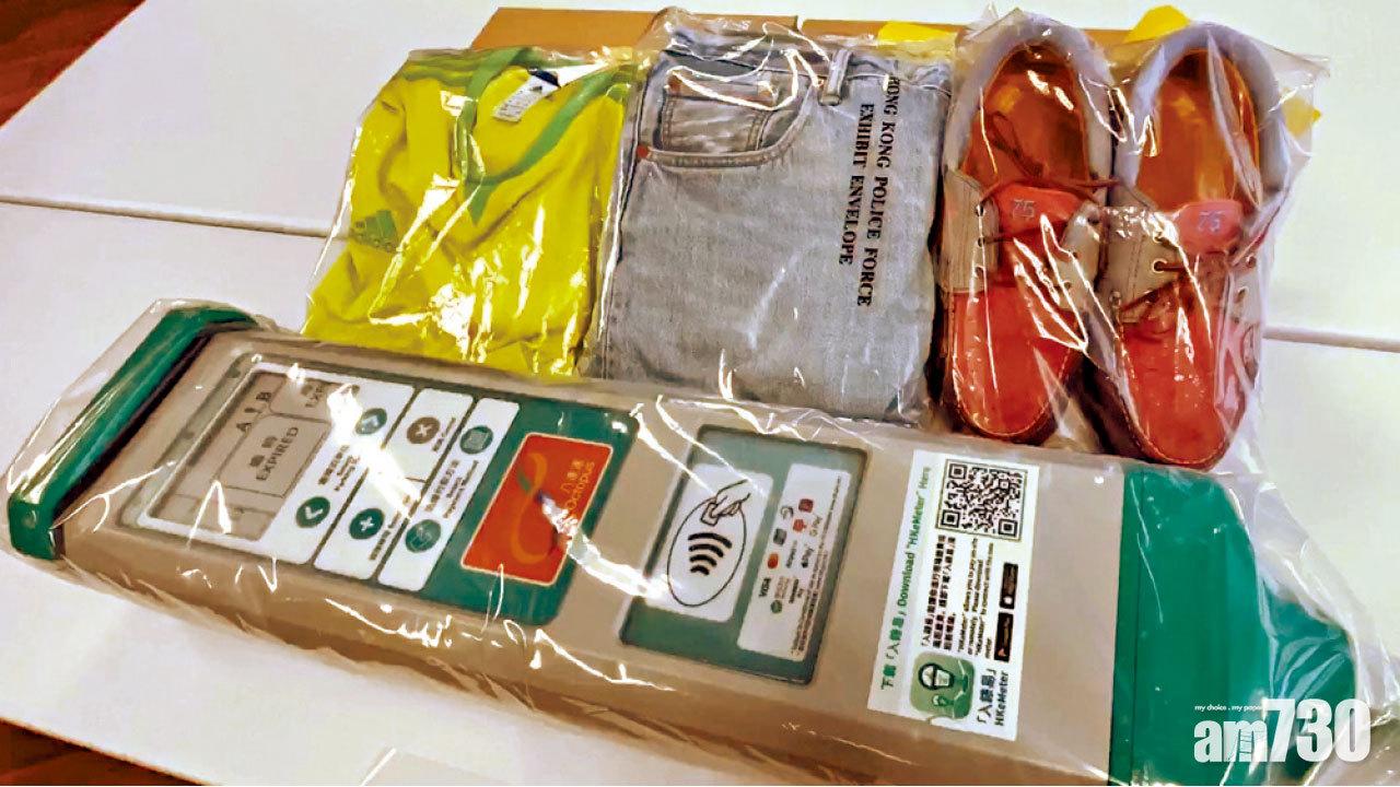 警方展示起回咪錶,及疑犯犯案時穿著衣物。