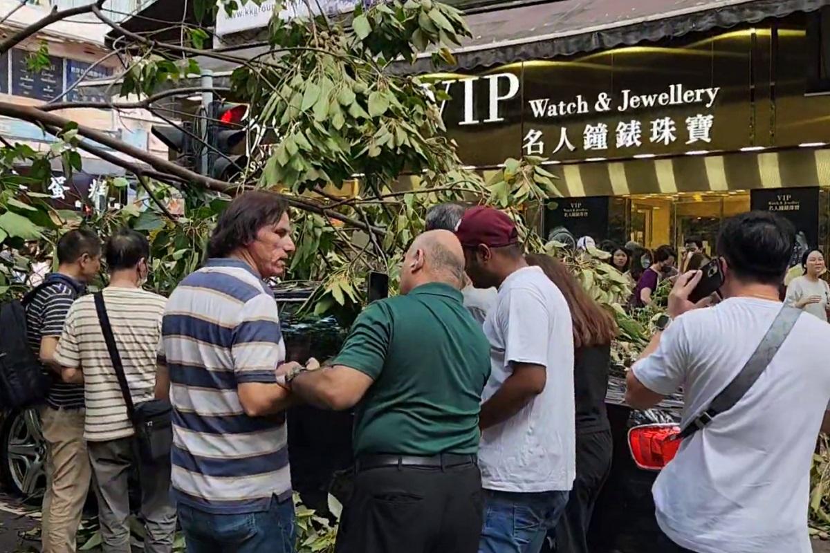 尖沙咀海防道今日(8日)下午有大樹倒塌,壓住一輛途經的賓利房車,司機一度被困,由消防員救出車外,司機報稱胸口不適,送往伊利沙伯醫院治理。另外,截至今日下午4時,本港錄得4宗塌樹報告。