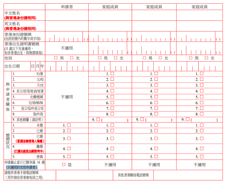 - 房委會轄下公屋、房協轄下出租屋邨或任何資助房屋計劃單位住戶的家庭成員