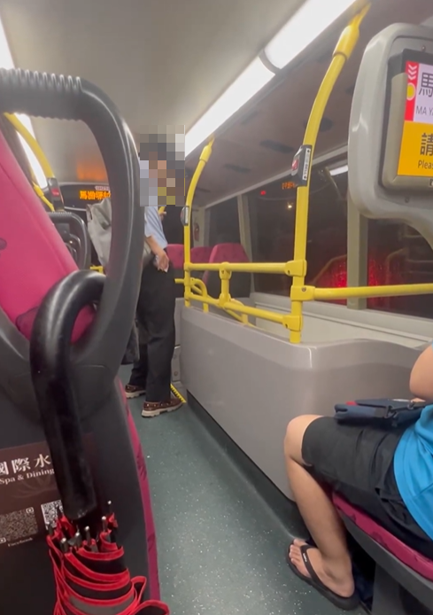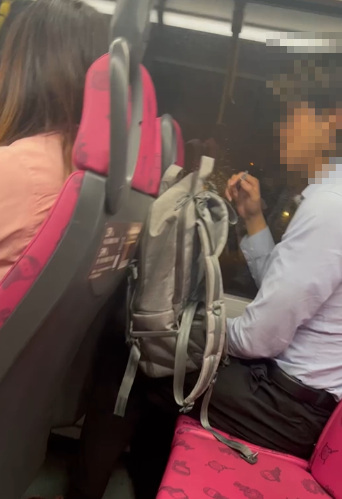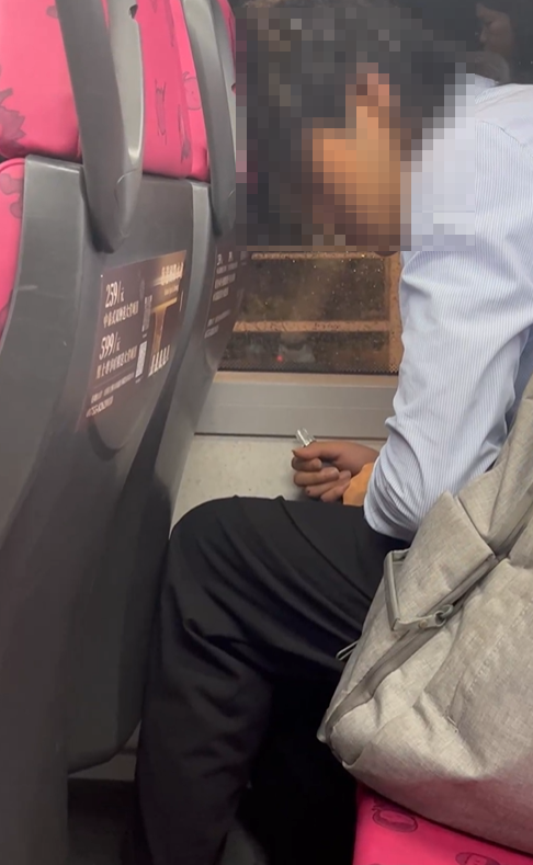 該名網民拍攝到一名穿恤衫的巴士乘客,手持一支電子煙機,懷疑他正吸食太空油。「一開始都唔肯定係咪太空油,後尾愈嚟愈Free(自由),食到瞇晒眼,食完仲暈咗咁。落樓梯先慘,慢動作。想擺返電話喺褲袋,左邊擺唔到擺右邊,再成隻樹懶咁典落去。其實佢咁嘅狀態返唔返到屋企?」樓主更指與女兒吸食到「二手油」後感到頭暈。